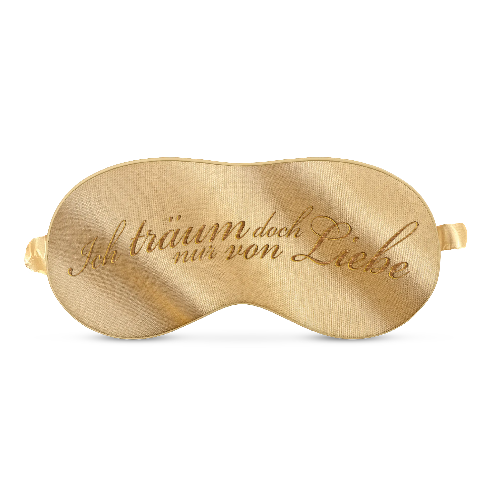 Die zauberhafte "Ich träum doch nur von Liebe" Schlafmaske ist goldfarben und hat auf der Vorderseite den gestickten Schriftzug "Ich träum doch nur von Liebe". Die Rückseite der Schlafmaske ist glatt, die Stickrückseite ist nicht sichtbar.